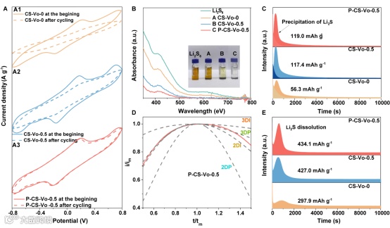 图3. (A)对称电池循环开始时和循环结束后的CV曲线;(B) Li2S6吸附图和紫外可见光谱;(C) 不同催化剂的成核过程;(D) P-CS-Vo-0.5对应的无量纲瞬态曲线;(D)不同催化剂对Li2S的解离过程。
