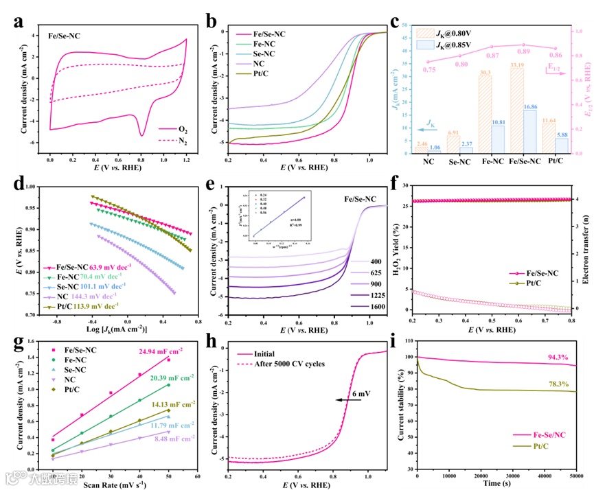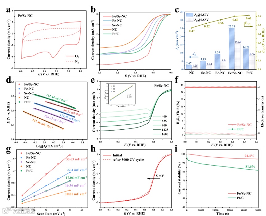 在 0.1 M KOH(碱性)与 3.5 wt% NaCl(中性)两种不同电解质环境中,Fe/Se-NC 催化剂均展现出优异的ORR活性,其半波电位分别达到 0.89 V 和 0.60 V(vs. RHE),显著优于多种对照组,动电流密度进一步证实了Fe/Se-NC的优越ORR性能。同时,该催化剂在两种条件下均表现出较低的 Tafel 斜率,表明反应动力学响应迅速;Fe/Se-NC表现出四电子转移途径,以及较低的过氧化氢产率;此外,Fe/Se-NC在所有测试催化剂中展现出最大的双层电容,证实了其在有效电化学表面积内拥有大量的可接触活性位点;长期稳定性测试显示,经过多次循环后电流保持率仍处于高水平,验证了其在不同电化学环境中的结构稳固性与活性位点持久性。