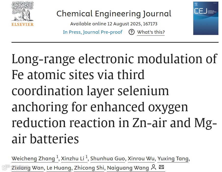 近日,来自广东工业大学的王乃光,在国际知名期刊Chemical Engineering Journal上发表题为“Long-range electronic modulation of Fe atomic sites via third coordination layer selenium anchoring for enhanced oxygen reduction reaction in Zn-air and Mg-air batteries”的文章。该工作利用化学气相沉积法在分级多孔氮掺杂碳材料中实现Fe和Se单原子共分散,构建Fe−N4与Se−C2协同体系。密度泛函理论(DFT)计算表明,Se−C2结构可在第三配位层实现对Fe中心的长程电子调控,从而提升ORR催化活性与稳定性。