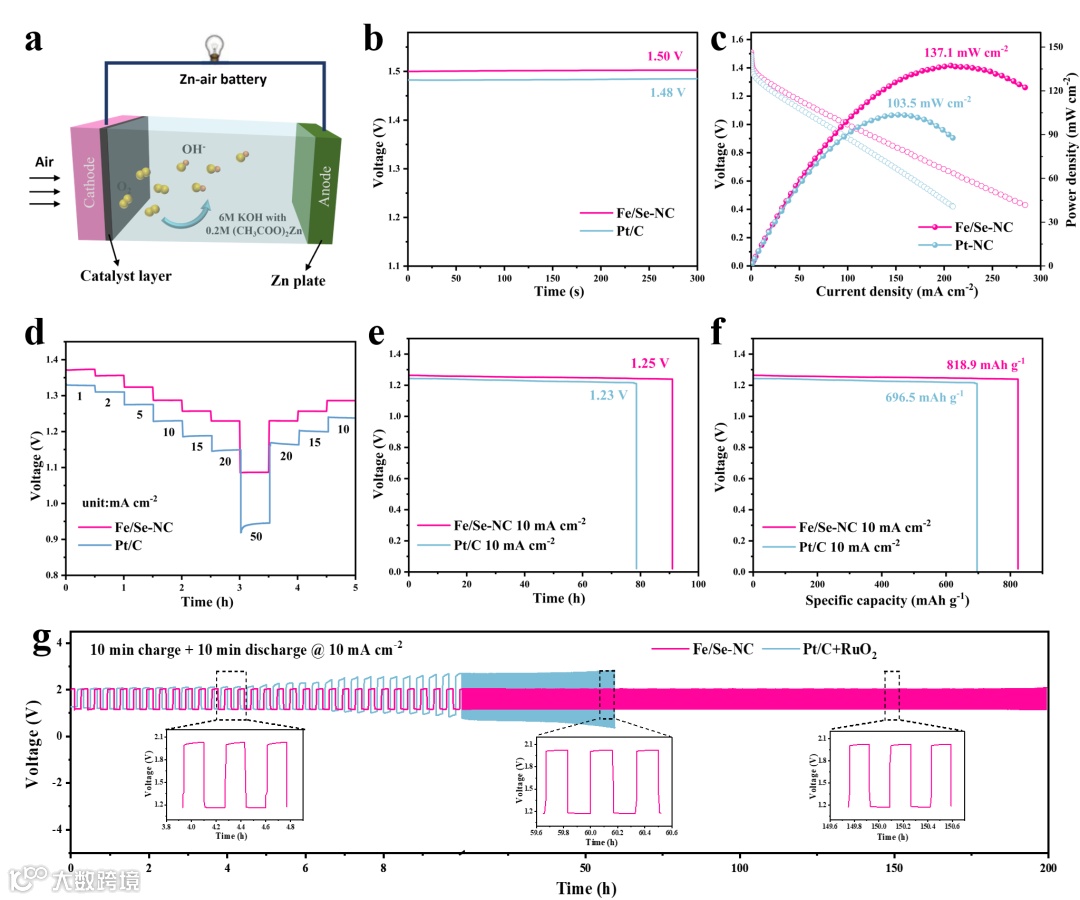 将 Fe/Se-NC 催化剂应用于实际 Mg–air和 Zn–air电池中,其电化学性能明显优于商业 Pt/C。具体表现为更高的开路电压、更大的峰值功率密度,在每个电流密度下Fe/Se-NC的输出电压均高于Pt/C,以及在长时间恒流放电测试中仍能保持较高且稳定的放电电压。以Fe/Se-NC为催化剂的镁空气和锌空气电池性能的增强源于其固有的催化活性和独特的结构特征。多孔结构同时扩大了电化学活性表面积,优化了空气阴极的固-液-气界面接触,显着增强了ORR动力学,同时确保了高效的质量传输和电荷转移。这种一体化结构设计最终提高了放电效率和运行稳定性,从而实现了出色的电池性能。