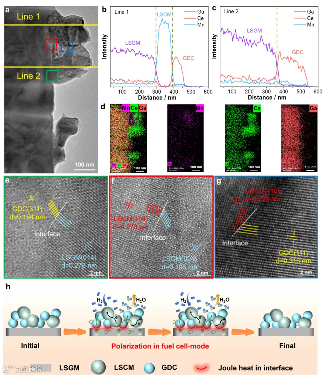 图4. 800 °C进行100 h燃料电池稳定性测试后,LSCM-50GDC电极电解质界面处的形态及元素分布:a) TEM图,b) 沿线1的元素扫描,c) 沿线2的元素扫描,以及d) 元素面扫分布图。异质界面的HRTEM图像:e) GDC与LSGM间,f) LSCM与LSGM间,及g) LSCM与GDC间。h) 极化条件下LSCM-50GDCLSGM界面原位构筑示意图