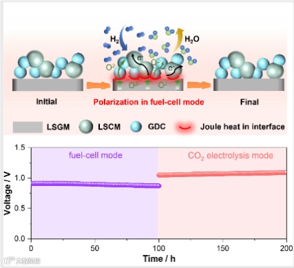 近日,来自福州大学材料学院的陈孔发教授和福州大学福建省高校测试中心的艾娜博士,在国际知名期刊Advanced Functional Materials上发表题为“Heterogeneous La0.75Sr0.25Cr0.5Mn0.5O3-Based Nanocomposite Hydrogen Electrode for Efficient and Durable Solid Oxide Cells”的文章。该文章通过结合自组装合成法与直接组装电极构筑技术,开发了一种用于SOC高效耐久的LSCM-Gd0.1Ce0.9O1.95(GDC)纳米复合氢电极,对应单电池在燃料电池和电解CO2模式下均获得优异的电化学性能和运行稳定性。研究结果表明,自组装合成法成功制备了具有丰富LSCM─GDC异质界面的纳米复合粉体,其中GDC的加入显著抑制了LSCM的团聚和长大,同时提升了电极的离子电导率。异质界面有利于扩展电极的TPB、形成更多的表面氧空位、暴露额外的活性位点等。同时,直接组装电极构筑技术也使纳米复合电极的微结构更加稳定,避免了传统烧结过程中发生的微结构粗糙化,有效地保留了电极粉体原始的纳米结构和丰富的异质界面;此外,通过在电池运行条件下施加极化电流,首次成功实现了氧化物复合氢电极与电解质间界面的原位构筑。本研究为开发高活性、耐久的LSCM基纳米复合氢电极提供了新的思路。