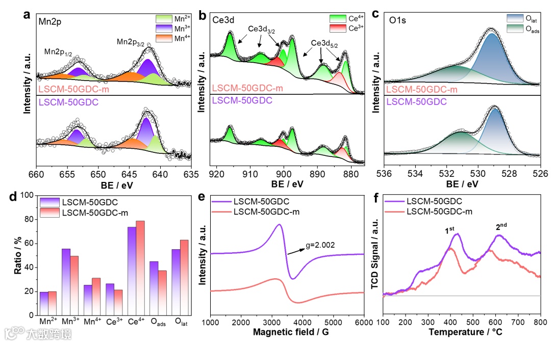 图2. LSCM-50GDC和LSCM-50GDC-m的XPS谱图:a) Mn 2p,b) Ce 3d,c) O 1s,d) Mn、Ce和O在不同价态下的比例,e) EPR,以及f) H2-TPR曲线