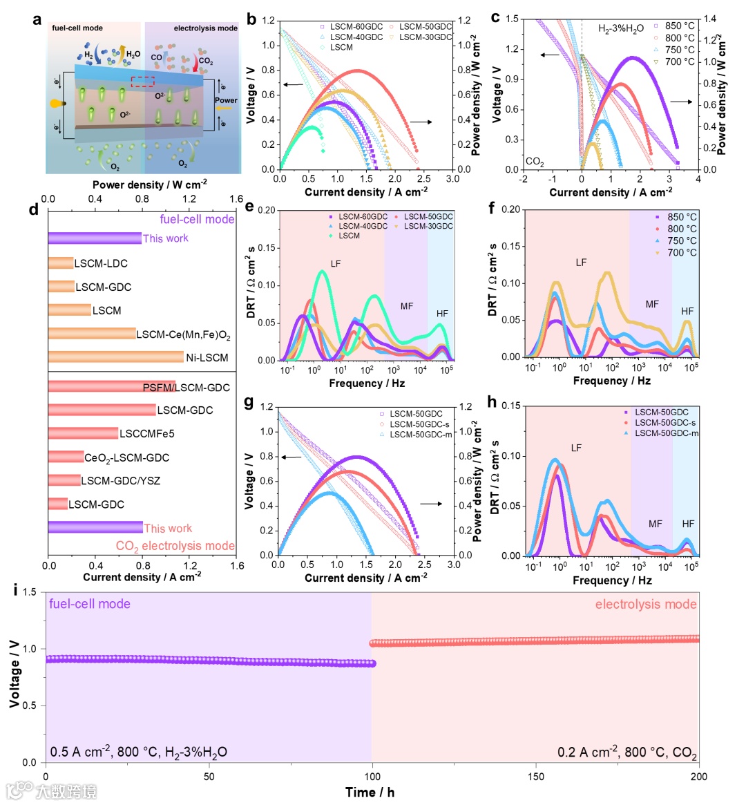 图3. a) 在燃料电池和CO2电解模式下单电池工作示意图。单电池的I–V和I–P曲线及DRT分析:b、e) 不同GDC含量的LSCM-GDC电极,c、f) 不同温度下的LSCM-50GDC电极,以及g、h) LSCM-50GDC、LSCM-50GDC-s和LSCM-50GDC-m复合氢电极。d)文献中报道的基于LSCM氢电极的单电池与本研究中在800 °C下PPD和1.5 V时CO2电解电流密度对比。i) LSCM-50GDC单电池在燃料电池模式和CO2电解模式下的稳定性测试曲线