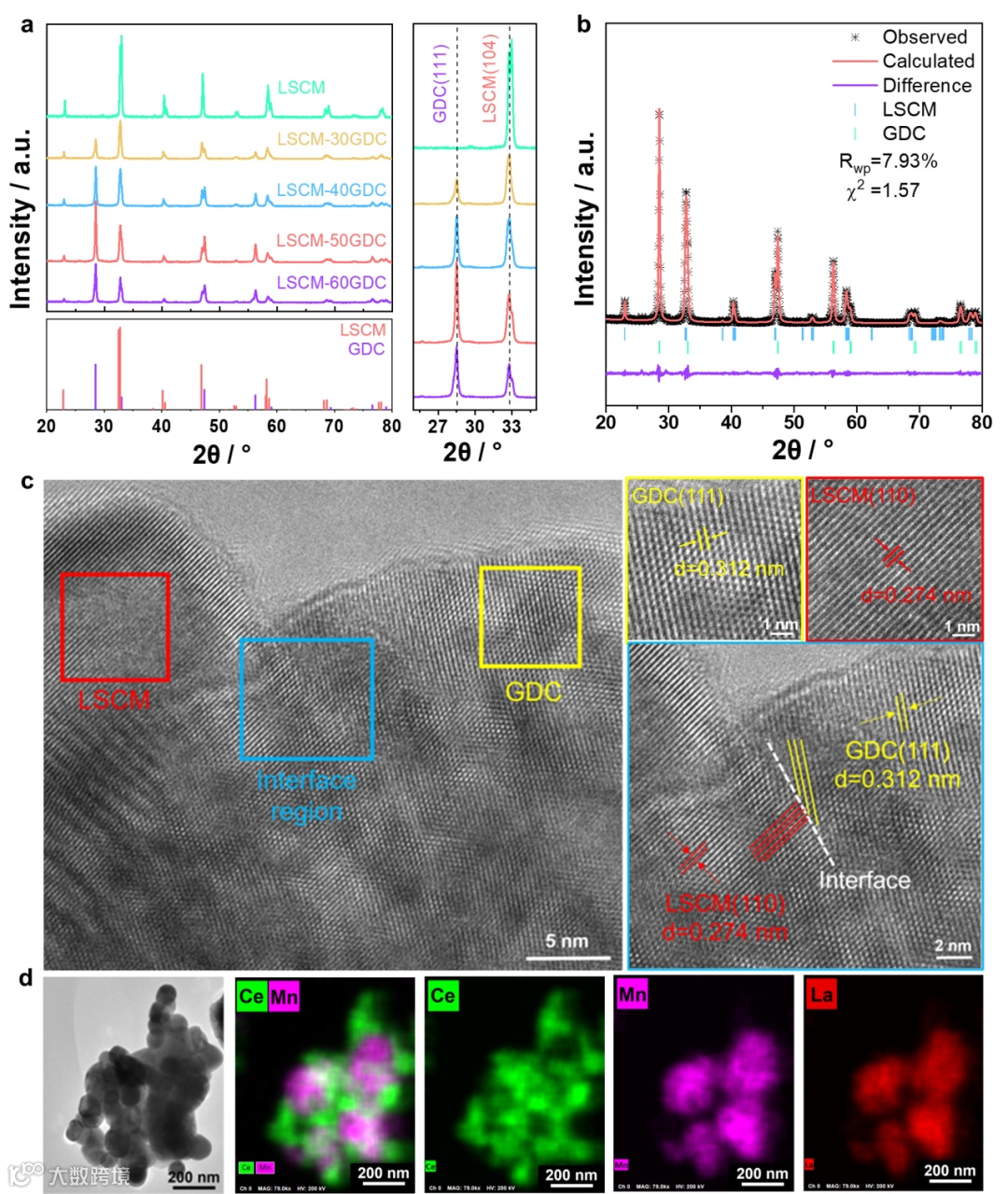 图1. a) 不同GDC含量的LSCM-GDC纳米复合材料的XRD谱图。LSCM-50GDC的b) Rietveld精修谱图,c) HRTEM图像,以及d) TEM图像和EDS元素分布图