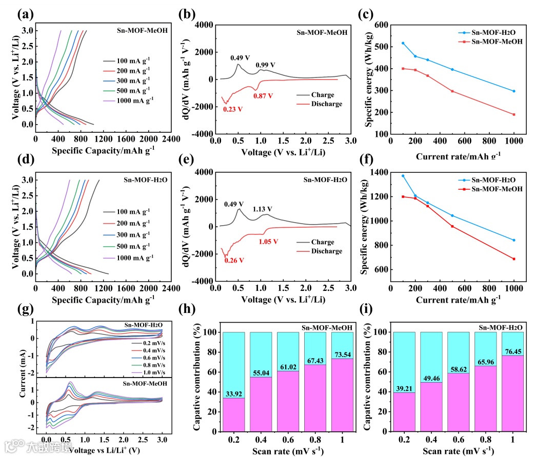 图4 (a, d) Sn-MOF-MeOH和Sn-MOF-H2O在不同电流密度下的首次充放电曲线;(b, e) Sn-MOF-MeOH和Sn-MOF-H2O在100 mA g-1电流密度下的微分电容(dQ/dV)随电位(V)的变化曲线;(c) Sn-MOF-MeOH和Sn-MOF-H2O的放电比能量比较;(f) Sn-MOF-MeOH和Sn-MOF-H2O的充电比能量比较;(g) Sn-MOF-MeOH和Sn-MOF-H2O在不同扫描速率下的CV曲线;(h, i) Sn-MOF-MeOH和Sn-MOF-H2O在不同扫描速率下的假电容贡献率。