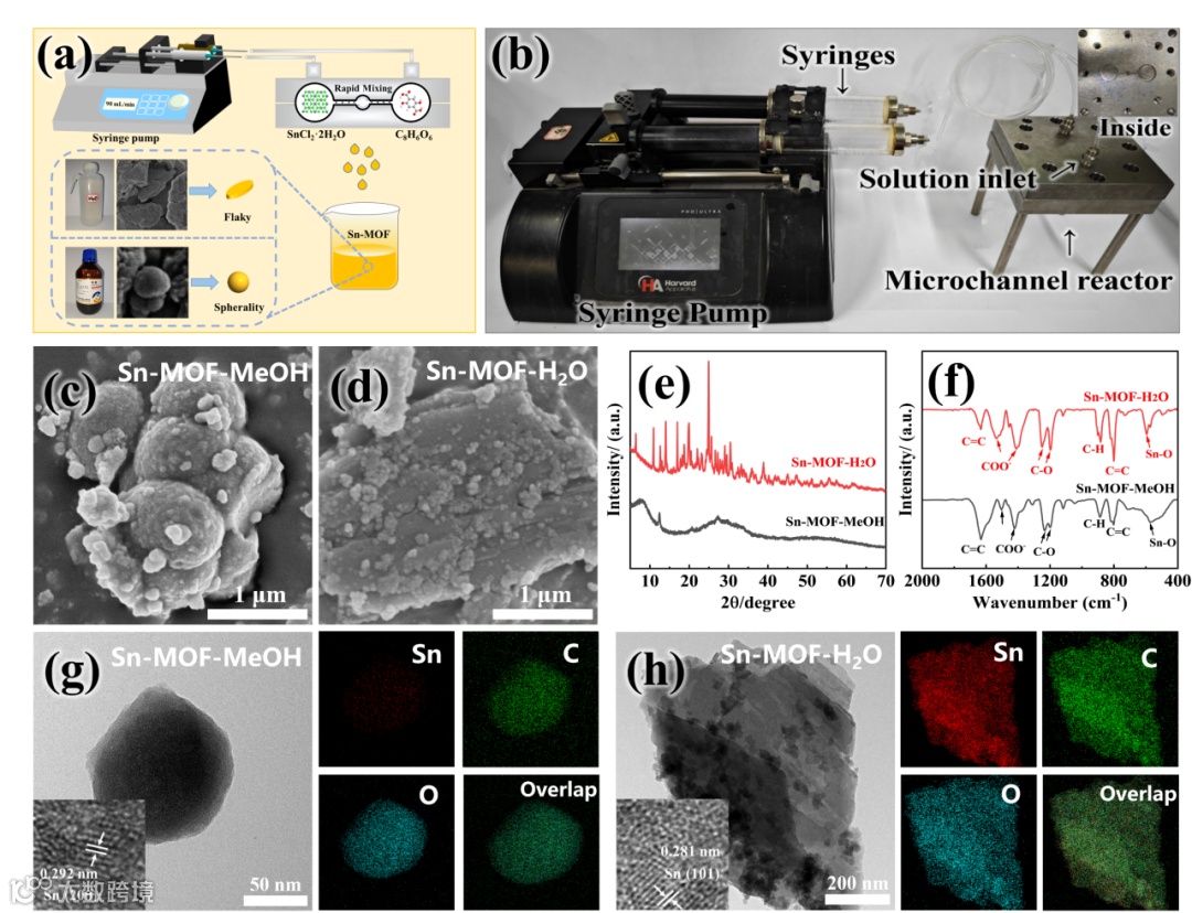 图1 (a) Sn-MOF-H2O和Sn-MOF-MeOH的合成过程流程图;(b) 微通道反应器的实物外观;;(c, d) Sn-MOF-MeOH和Sn-MOF-H2O的SEM图像; (e) Sn-MOF-MeOH和Sn-MOF-H2O的XRD图谱;(f) Sn-MOF-MeOH和Sn-MOF-H2O的FT-IR光谱。(g, h) Sn-MOF-MeOH和Sn-MOF-H2O的HRTEM图像(插图)和TEM图像,以及EDS元素映射(右侧)