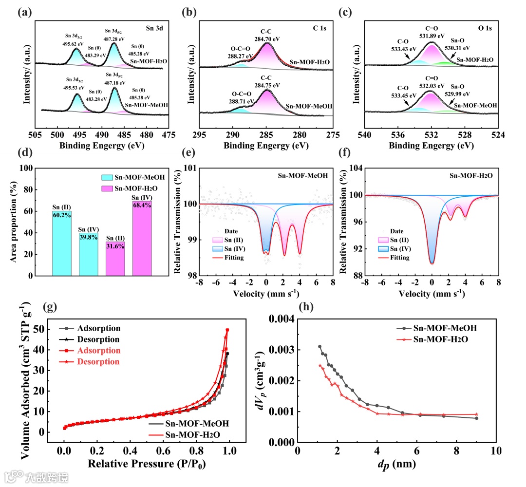 图2 (a, b, c) Sn-MOF-MeOH和Sn-MOF-H2O的XPS谱图;(d) Sn-MOF-MeOH和Sn-MOF-H2O中Sn(II)和Sn(IV)的峰面积比;(e, f) Sn-MOF-MeOH和Sn-MOF-H2O的119Sn穆斯堡尔谱,谱图拟合为两个双峰:粉色双峰归属于Sn(II),蓝色双峰归属于Sn(IV);(g) Sn-MOF-MeOH和Sn-MOF-H2O的氮气吸附-脱附等温线;(h) Sn-MOF-MeOH和Sn-MOF-H2O的孔径分布。