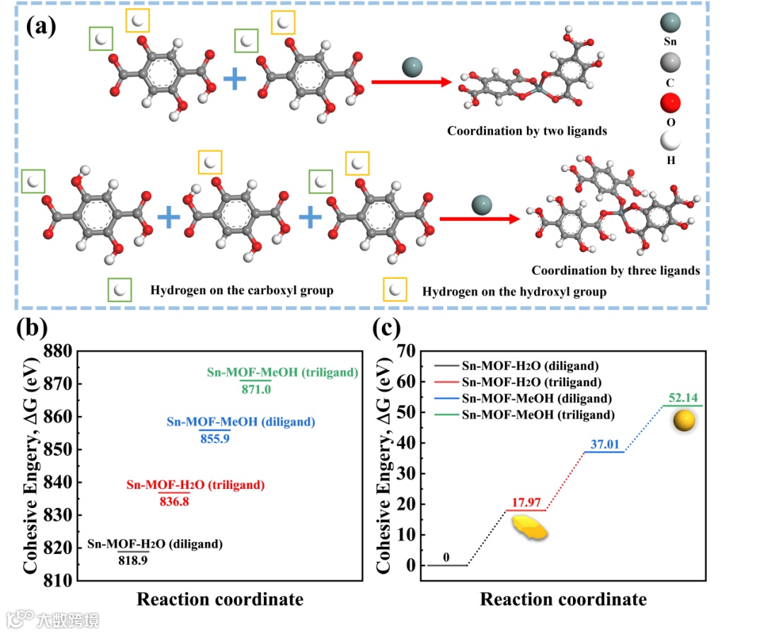 溶剂调控Sn-MOF形貌的理论机制可概括为:第一性原理计算表明,三配位结构因内聚能更高而更稳定。甲醇中,高内聚能促使颗粒团聚成球形以降低表面能;水中,高介电常数减缓成核速度,使晶核充分生长为不规则块状。此外,水相Sn-MOF中Sn4+与配体形成丰富Sn-O键,其配位作用有效锚定Sn原子,抑制团聚,进一步稳定不规则形貌。这种溶剂依赖的形貌调控为MOF锂电负极设计提供了理论指导。