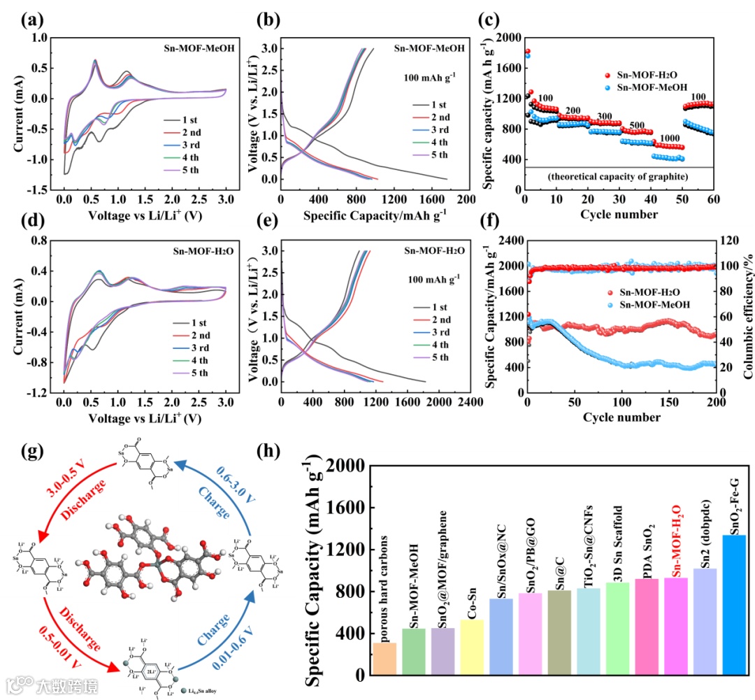 图3 Sn-MOF-MeOH和Sn-MOF-H2O的电化学性能分析。(a, d) Sn-MOF-MeOH和Sn-MOF-H2O在0.2 mV s-1扫描速率下的循环伏安(CV)曲线;(b, e) Sn-MOF-MeOH和Sn-MOF-H2O在前五个循环中的充放电曲线;(c) Sn-MOF-MeOH和Sn-MOF-H2O的倍率性能;(f) Sn-MOF-MeOH和Sn-MOF-H2O在100 mA g-1电流密度下的循环性能;(g) 非晶态Sn-MOF-H2O在充放电过程中金属中心和有机配体逐步锂化和去锂化的示意图;(h) 不同材料的循环性能对比。