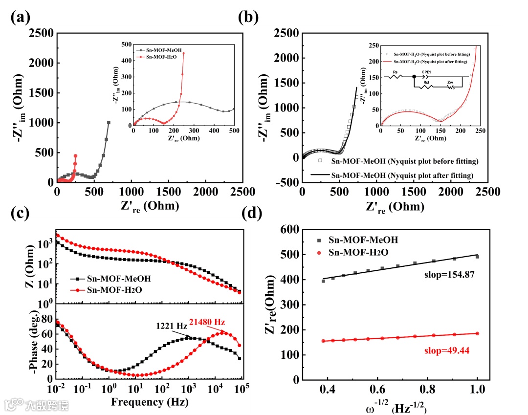 图5在0.01 Hz-10 MHz频率范围内,施加10 mV振幅的条件下,于组装阶段进行了EIS(电化学阻抗谱)测量。(a)Sn-MOF-MeOH和Sn-MOF-H2O的Nyquist图;(b) 拟合的Nyquist图以及等效电路图(插图);(c) 展示相角随频率变化的Bode图。(d) 低频区观察到的Z′与频率平方根(ω-1/2)的关系。