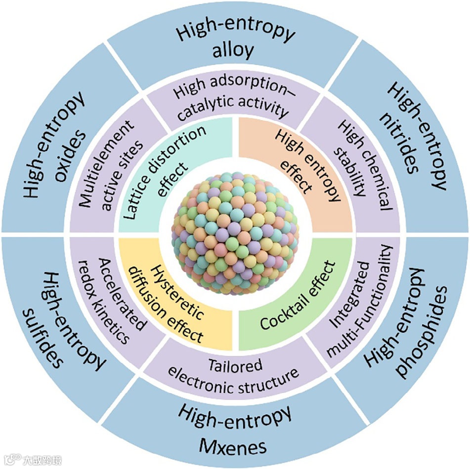 高熵催化剂由五种或更多金属元素按接近等摩尔比混合,形成稳定的单相固溶体,其高配置熵结构能够有效提高材料的稳定性和催化活性。与传统的二元或三元催化剂相比,高熵催化剂的无序排列提供了大量的活性位点,这些位点有助于吸附和转化LiPS。此外,高熵催化剂的独特结构使得材料能够调节电子结构,优化与LiPS的相互作用,从而加速电池中硫的氧化还原反应并提升电池的循环稳定性。这些优势使得HEC在锂硫电池的应用中展现了出色的性能。高熵催化剂的催化性能源自其复杂的多元素组合和高配置熵效应。具体来说,HEC通过四种主要效应显著提升催化性能。高熵效应:高熵效应通过最大化配置熵,使材料在热力学上更加稳定,避免了不同金属元素之间的相分离现象。在锂硫电池中,这种效应有助于保持催化剂的结构均匀性,提升电池器件在长循环中的稳定性。鸡尾酒效应:在HEC中,不同金属元素的协同作用可以产生超出简单元素平均效果的性能提升。通过优化不同金属之间的相互作用,HEC能够增强对LiPS的化学吸附,从而减少穿梭效应并促进LiPS的快速转化。迟滞扩散效应:HEC的原子级无序结构使得原子的迁移速度减慢,这一特性可以有效抑制在电化学循环中表面重构以及相转变,增强了催化剂耐受性。晶格扭曲效应:由于不同金属元素的原子半径和化学键合偏好差异,HEC内部常常出现晶格扭曲现象,这种扭曲产生了局部应变,并生成了活性位点。这些位点能够有效降低反应的活化能,从而加速LiPS的转化过程。