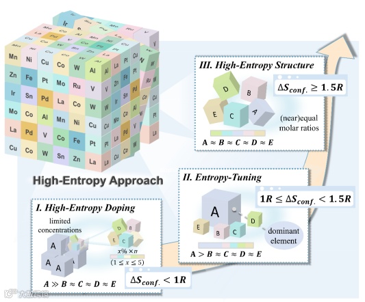 随着高熵理念在材料科学领域的深入拓展,构建多组分、强无序的复杂体系已成为先进功能材料设计的重要方向。伴随着掺杂元素数量的增加,体系中元素之间的相互作用趋于复杂,不仅改变了材料的局部化学环境,也显著提升了整体构型熵(ΔSconfig),即系统的无序程度。这一构型调控趋势进一步催生了多种基于高熵原理的材料优化策略,例如熵调协工程和高熵掺杂等。