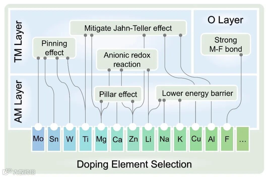 在层状氧化物正极材料的构型调控中,掺杂元素的选择与掺杂位点的设计对实现性能优化具有决定性意义。通过合理设计掺杂策略,不仅可以增强材料的结构稳定性,还能有效缓解其在循环过程中的相变倾向与电化学退化问题。掺杂策略的核心在于通过异质元素的引入,调节晶体场环境、电荷分布与电子/离子输运路径,从而赋予材料新的功能特性。