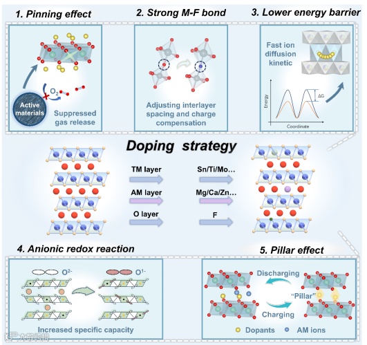 本文系统回顾了碱金属离子层状氧化物(如LiNiₓMnyCozO₂、NaTMO₂等)中常见掺杂元素(如Mg、Ti、Al、Zn、Fe、Cu等)在不同位点(AM位点、TM位点、O位点)的应用实践,总结出多种掺杂路径对材料结构和性能的具体影响(图4)。在此基础上,作者进一步构建了掺杂元素—掺杂位点—关键改性效应三者之间的系统关联框架,归纳出传统掺杂策略在层状正极材料中常见的五类核心调控作用(图5)。该总结不仅揭示了掺杂设计背后的结构-性能耦合机制,也为后续在高熵与多元协同体系中开展精细元素调控提供了理论基础和设计指导。