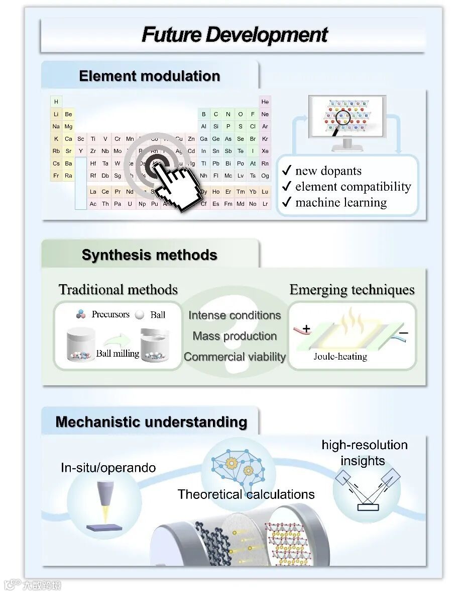 传统的掺杂和高熵方法都为进一步的研究和创新提供了广阔的前景,二者在元素调控、合成工艺优化及作用机理研究等方面均展现出巨大的发展潜力。随着研究的不断深入,未来重点将聚焦于更全面地了解掺杂和高熵材料中元素组合、结构特征和电化学性能之间的关系,最终指导下一代先进储能材料的设计。