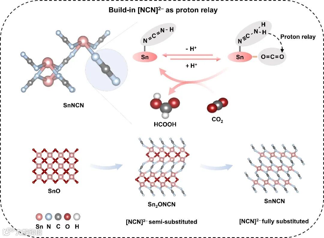 图1:ECO2R过程中[NCN]2−作为内置质子中继站的示意图;按[NCN]2−含量的递增顺序排列SnO、Sn2ONCN和SnNCN的示意图。