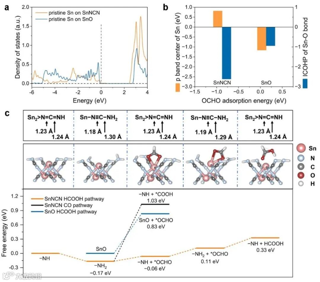 图5:SnNCN和SnO上进行ECO2R的吉布斯自由能图,以及SnNCN在反应过程中的结构变化示意图。