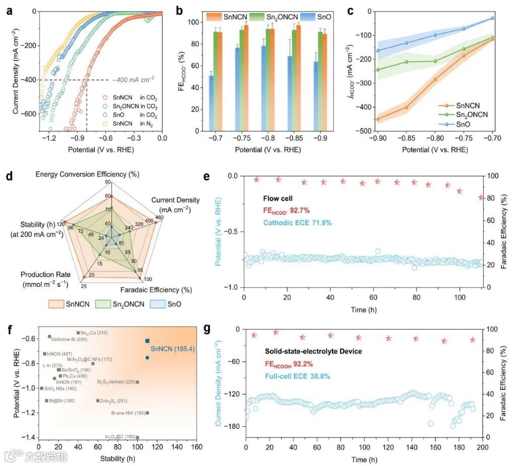 SnNCN在–0.56 VRHE(360mV过电位,经iR校正)下实现450 mA cm–2的甲酸盐电流密度(jHCOO–),显著高于Sn2ONCN(243 mA cm–2)和SnO(163 mA cm–2)。SnNCN的生产速率达到20.7 mmol m–2 s–1,分别是Sn2ONCN和SnO的1.9倍和3.3倍。CO2到甲酸盐的阴极能量转换效率(ECE)最高为79.6%。在–0.62 VRHE下,SnNCN在流动池中以200 mA cm–2的电流密度连续运行超过110小时,平均FE为92.7%,ECE为71.8%。此外,在固态电解质电解池中,–3.4 V下以–135.8 mA cm–2的电流密度稳定运行192小时,FE为92.2%,全电池ECE为38.8%,生产得到0.88 M的纯甲酸水溶液,避免了传统液相体系的产物分离难题。