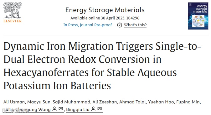 基于此,东北师范大学刘炳求团队提出了一种新的重建策略,在富含空位的PBAs中原位替代电活性铁,以提高循环稳定性和倍率性能。首先,在充电过程中,由于电极-电解质界面处形成梯度,电解质中金属离子的浸出受到限制。接下来,在放电过程中,电活性离子成功地被氮配位的惰性M离子(M: Ni,Cu)取代,在不牺牲晶体结构完整性的情况下增加了容量。这种新调节的晶体结构及其氧化还原活性表面可以为离子和电子的扩散提供导电途径,并改善动力学和速率性能。所得样品显示出高达7000 mA g-1的优异倍率性能,以及在高达10000 mA g-1超高电流密度下的数千次循环。这些发现可以拓宽SE-HCF在水系电池领域的应用。其成果以题为“Dynamic Iron Migration Triggers Single-to-Dual Electron Redox Conversion in Hexacyanoferrates for Stable Aqueous Potassium Ion Batteries”在国际知名期刊Energy Storage Materials上发表,第一作者为国际留学生Usman Ali。