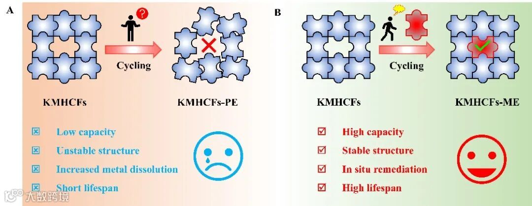 图1. 循环过程中(A)纯(KMHCF-PE)和(B)改性(KMHCFs-PE)电解质中KMHCFs电极的示意图比较。