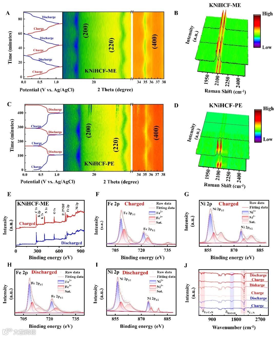 图4. KNiHCF ME(A和B)和KNiHCF PE(C和D)的三条GCD曲线以及相应的原位XRD和原位拉曼光谱图。充放电后KNiHCF ME的XPS总图谱(E)。HR-XPS Fe 2p和Ni 2p在充电(F和G)和放电(H和I)电极后。充放电KNiHCF ME电极三个循环的FTIR曲线(J)。