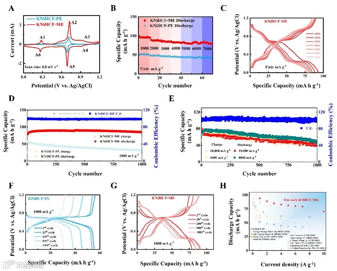 图3. KNiHCF PE和KNiHCF ME电极在0.8 mV s-1(A)下的CV曲线、倍率性能(B)和1000 mA g-1(D)下的循环性能。在1000至7000 mA g-1的不同电流密度下的恒电流充放电(GCD)曲线。KNiHCF ME电极在4000和10000 mA g-1下的循环性能。在1000mA g-1的循环过程中,KNiHCF PE(F)和KNiHCF ME(G)电极的选定GCD曲线(第2、20、200、500和1000次循环)。H)KNiHCF ME与之前报告的PBAs的比较。