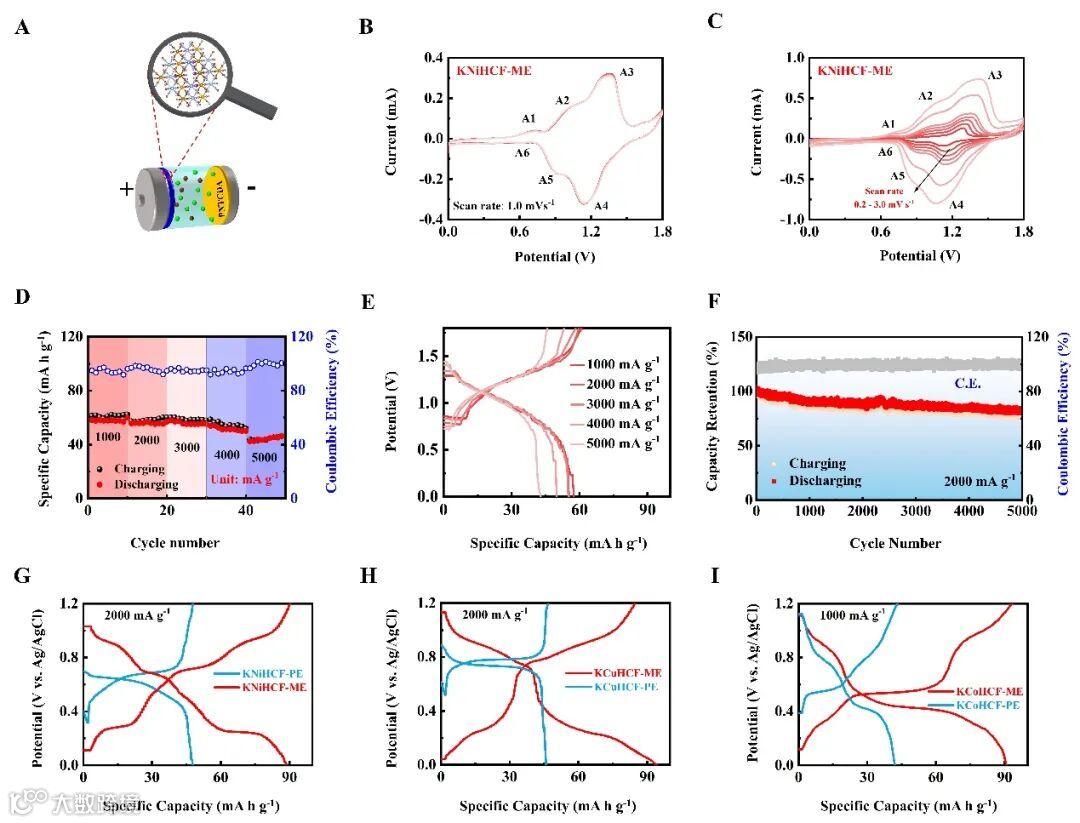 图5. KNiHCF ME//PNTCDA全电池示意图(A)和不同扫描速率(C)下相应CV曲线(B)。全电池在1000至5000 mA g-1(D)范围内的倍率性能和相关GCD曲线(E)。全电池的长期循环性能(F)。KNiHCF(G)、KCuHCF(H)和KCoHCF(I)在纯电解质(PE)和改性电解质(ME)中的GCD曲线比较。