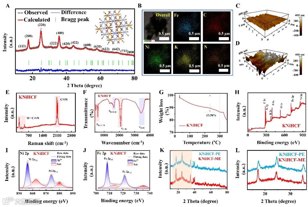 图2. (A)KNiHCF样品的Rietveld细化XRD。(B)KNiHCF样品的TEM元素图。改性电解质(C)和纯电解质(D)中KNiHCF电极的AFM图像。(E)KNiHCF的拉曼光谱、(F)傅里叶变换红外光谱、(G)热重分析和(H)XPS总谱。KNiHCF样品的Ni 2p(I)和Fe 2p(J)XPS光谱。KNiHCF PE和KNiHCF ME在数百次循环(K)后的原位XRD图和相应的放大光谱(L)。