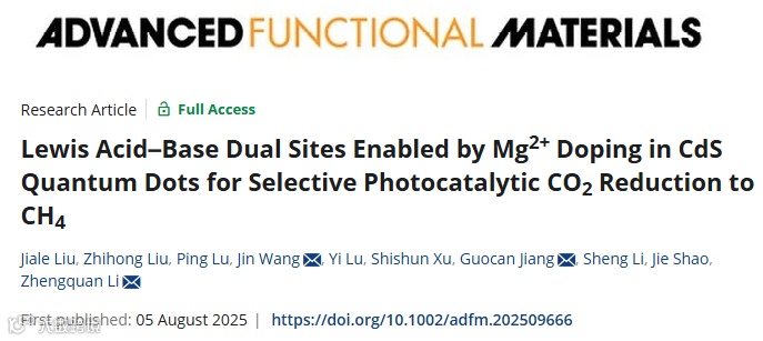 光催化CO2还原是解决能源危机和温室效应的关键技术,但量子点光催化剂因其吸附活化CO2能力弱等问题,光催化活性和产物选择性较低。浙江师范大学王靳、江国灿、李正全团队,首次通过掺杂碱土金属的策略,将Mg2+掺杂在CdS量子点中,获得了一种具有路易斯酸碱双位点特性的量子点光催化剂。该材料展现出较好的光催化甲烷产率(45.8 μmol·g⁻¹·h⁻¹)和选择性(88.7%)。这一成果为设计高效光催化剂开辟了新路径。
