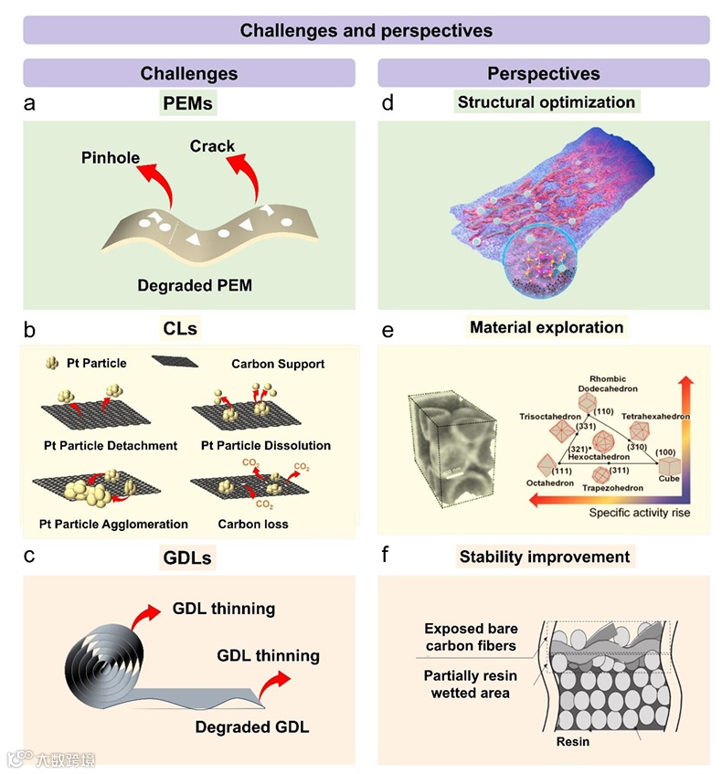 1.采用先进的表征技术与计算模拟相结合,深入了解HT-PEMFC中PEM的降解机制;2.除了传统的PFSA、SHP和PBI膜外,应探索新型膜材料,特别是具有优越性能的酸碱复合膜。3.结合原位/operando同步x射线吸收光、原位/operando TEM和SEM,先进的计算技术,进一步了解高温条件下基于PGM和无PGM的体系的降解机理和材料行为;4.除了优化目前研究的碳基支架外,创新的非碳基底,如金属碳化物、金属氮化物和金属硼化物,显示出完全缓解HT-PEMFC中碳腐蚀挑战的巨大潜力。5.开发具有优异抗氧化性能的微孔碳层,优化其组成,提高其机械、热、化学稳定性;6.针对碳纸层/微孔碳层/催化剂层界面,提出了多维HT-PEMFC CFD模型、三维稳态模型、一维非等温模型、准二维数值模型、孔隙尺度模型等质量输运模型,进一步缓解PA损失问题,提高使用寿命,重点优化电流/电压分布和气/水输运机制;7.结合高通量计算方法、人工智能技术和原位观察技术,阐明碳纸/微孔碳/CLs的构效关系及其降解机理,为设计高耐用的碳纸/微孔碳层提供依据。