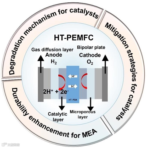 高温质子交换膜燃料电池(HT-PEMFC)凭借其显著的反应动力学优势、优异的燃料/气体杂质耐受性以及简化的水热管理系统,展现出广阔的应用前景。然而,当前催化剂体系及膜电极组件(MEAs)在性能表现与耐久性方面的不足,严重制约了HT-PEMFC的实际规模化应用。为推进该领域的突破性发展,本文系统梳理了催化剂与MEAs的最新研究进展,深入解析催化剂的降解机制并提出针对性缓解策略,致力于为开发高性能、长寿命HT-PEMFC提供理论指导。同时,通过全面剖析现有技术瓶颈,进一步指明未来研究的关键方向。