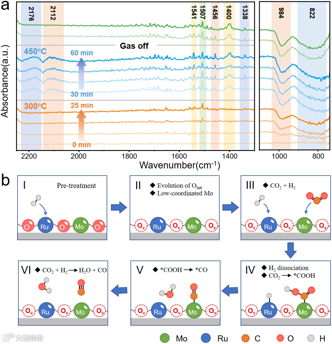 图 5 Ru-MoO3表面的原位研究。(a)反应条件下Ru-MoO3的原位DRIFT光谱。(b)CO₂加氢反应示意图。