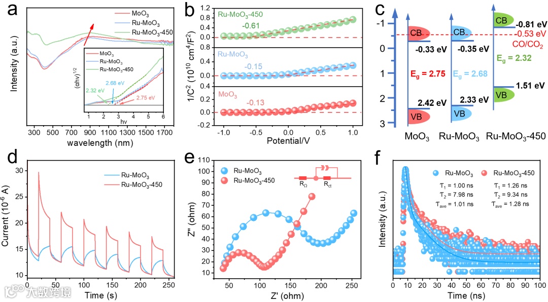 图 4(a)MoO3、Ru-MoO3和Ru-MoO3-450的紫外可见DRS。(b)MoO3、Ru-MoO3和Ru-MoO3-450的Mott-Schottky图和(c)带状结构。(d)Ru-MoO3和Ru-MoO3-450的瞬态光电流响应。(e)EIS图和(f)时间分辨PL光谱。