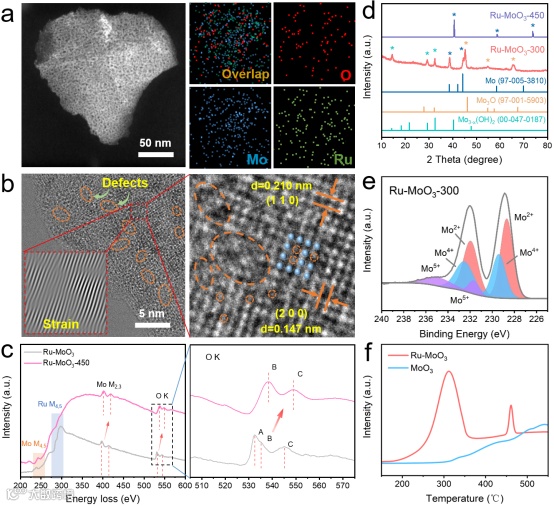 图 2(a)Ru-MoO3-450的HAADF-STEM图像和相应的EDS mapping。(b)Ru-MoO3-450的HR-TEM 图像和放大的HR-TEM图像。插图显示了虚线矩形区域的IFFT图像。(c)Ru-MoO3和Ru-MoO3-450的电子能量损失谱分析。(d)Ru-MoO3-450和 Ru-MoO3-300的XRD 图谱。(e)Ru-MoO3-300的Mo 3d XPS光谱。(f)Ru-MoO3和MoO3的H2-TPR光谱。