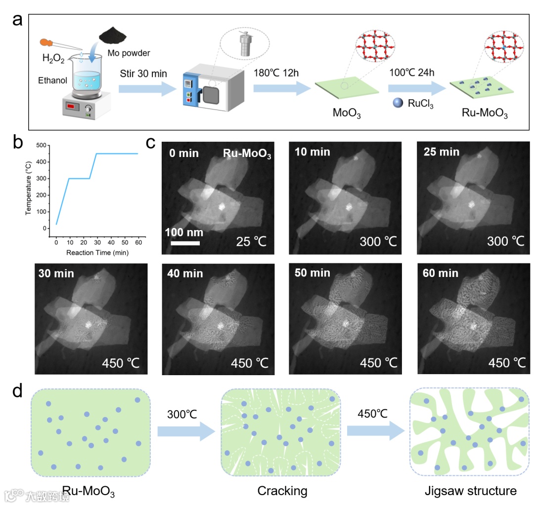 图 1(a)Ru-MoO3的制备过程示意图。(b)原位CO₂加氢的升温度程序。(c)CO₂加氢化过程中Ru-MoO3结构演变的HAADF-STEM图像。(d)CO₂加氢过程中Ru-MoO3结构演变示意图。