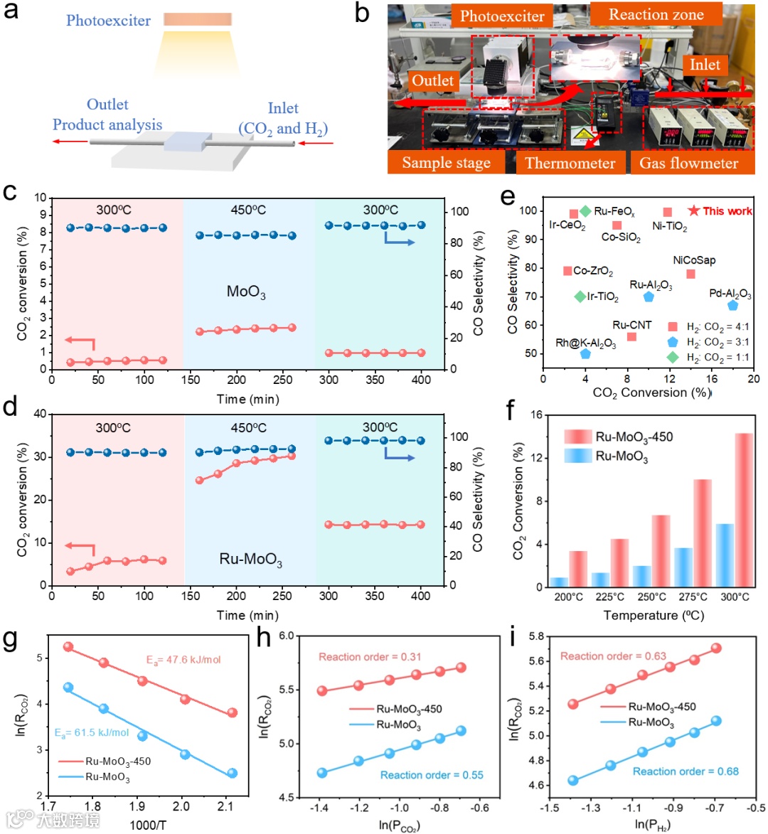 图3 催化剂的光热催化性能。(a)光热催化CO₂加氢操作示意图和(b)实体图。MoO3(c)和Ru-MoO3(d)的循环催化性能随温度变化。(e)Ru-MoO3-450与之前报道的二氧化碳加氢催化剂的性能比较。(f)Ru-MoO3和 Ru-MoO3-450的二氧化碳转化率与温度有关。(g)Ru-MoO3-450和Ru-MoO3的计算Ea。350°C时Ru-MoO3和Ru-MoO3-450(h)CO₂和(i)H2的反应级数。