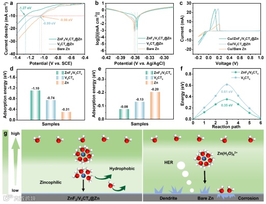 通过线性扫描伏安法(LSV)和线性极化测试证实ZnF2/V2CTx层对副反应的抑制作用(图4)。LSV测试显示,10.0 mA cm2电流密度下过电位顺序为ZnF2/V2CTx@Zn(−1.27 V)< V2CTx@Zn(−0.99 V)< 裸Zn(−0.98 V),表明其有优异的HER抑制能力。抗腐蚀测试中,ZnF2/V2CTx@Zn的腐蚀电流密度(0.19 mA cm2)和电位(−0.357 V)优于对照样品,塔菲尔斜率更小,证实其减缓HER和自腐蚀速率的效果。CV测试显示该材料具有更低形核过电位和更高电流响应,动力学性能优异。DFT计算表明,ZnF2/V2CTx对Zn原子吸附能(−1.10 eV)强于V2CTx(−0.74 eV)和裸Zn(−0.31 eV),对H2O分子吸附能(−0.08 eV)最低,且Zn2+迁移能垒(0.35 eV)显著低于V2CTx(0.61 eV),验证了其亲锌性、疏水性及快速离子传输特性。实验与计算共同表明,ZnF2/V2CTx层有效抑制HER并促进锌均匀沉积。