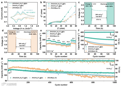 以ZVO为正极材料组装全电池,来验证ZnF2/V2CTx@Zn负极在锌离子电池中的可行性(图6)。ZVO//ZnF2/V2CTx@Zn全电池在自放电24小时后仍有87.6%的容量保持率,远高于ZVO//裸Zn和ZVO//V2CTx@Zn全电池。同时,ZVO//ZnF2/V2CTx@Zn全电池具有优异的倍率性能,在不同电流密度下均表现出比ZVO//裸Zn和ZVO//V2CTx@Zn全电池更高的比容量。在5.0 A g1的高电流密度下,ZVO//ZnF2/V2CTx@Zn全电池经过1000次循环后,容量保持率高达86.1%。这些结果均证实了ZnF2/V2CTx涂层在保护锌负极方面的潜力。