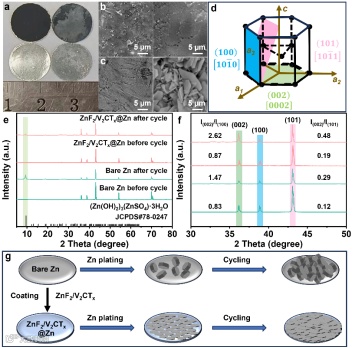 对循环前后的极片进行对比,ZnF2/V2CTx@Zn电极在3.0 mA cm2/1.0 mAh cm2下循环100次后表现出密集而平坦的沉积层(图3)。裸露的Zn失去了金属光泽,变的斑驳。随后,对裸Zn和ZnF2/V2CTx@Zn电极进行XRD检测,发现ZnF2/V2CTx@Zn电极中(002)晶面的衍射峰强度显著增强。ZnF2/V2CTx@Zn的I(002)/I(100)比值从0.87增加到2.62,而裸Zn仅从0.83增加到1.47。说明ZnF2/V2CTx@Zn诱导了锌沿(002)晶面优先沉积,从而实现稳定且无枝晶的锌负极。