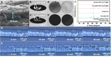 与裸锌电极相比,ZnF2/V2CTx@Zn电极展现出显著增强的疏水特性(图2)。通过对比10天电解液浸泡实验前后的XRD图谱发现,ZnF2/V2CTx涂层可有效抑制副反应产物(Zn(OH)2(ZnSO4)3·5H2O)的生成,表明其具备优异的抗化学腐蚀能力。同时,通过进一步通过原位光学显微电镜技术,实时观测锌负极在大电流密度(3.0 mA cm2)条件下持续1.0小时恒流沉积的动态过程。动态观测结果表明,ZnF2/V2CTx@Zn电极表面呈现均匀致密的锌沉积层,未观察到锌突起或枝晶形貌。与之形成鲜明对比的是,裸锌电极在相同工况下出现明显枝晶的快速生长。