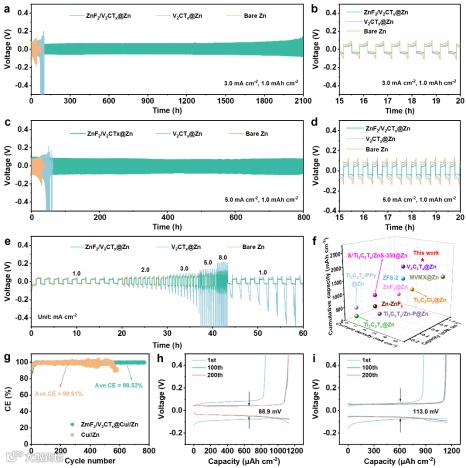 组装对称电池来评估ZnF2/V2CTx@Zn的循环寿命(图5)。ZnF2/V2CTx@Zn对称电池在3.0 mA cm2/1.0 mAh cm2条件下能够稳定运行2100小时且始终保持较小的过电位。即使在5.0 mA cm21.0 mAh cm2的电流密度下,ZnF2/V2CTx@Zn对称电池仍能保持稳定的电压超过800小时。组装非对称电池来评估ZnF2/V2CTx@Cu的可逆沉积/剥离行为。ZnF2/V2CTx@Cu//Zn非对称电池在5.0 mA cm2/1.0 mAh cm2条件下,经过750个循环后平均库仑效率(CE)为99.52%。这证明ZnF2/V2CTx涂层枝晶形成和副反应具有显著抑制作用,可有效提升锌负极可逆性。