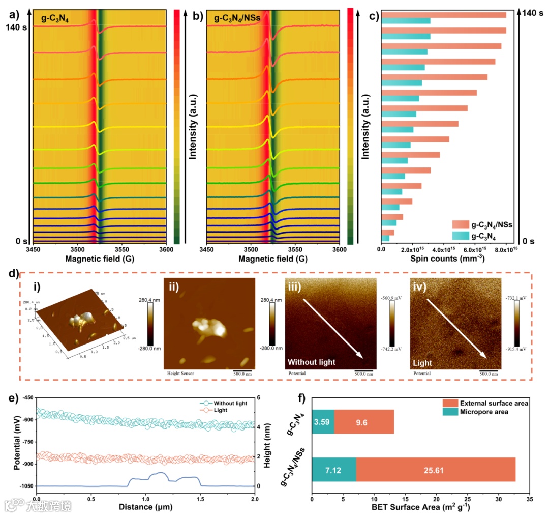原位EPR光谱对未配对的电子进行了研究。g=2.0042的洛伦兹线,对应于七嗪环上的离域电子。结果表明g-C3N4/NSs具有最多的离域电子,并且在光下可以进一步增加,有利于光生载流子迁移。