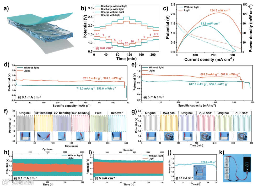 电池性能测试表明,光辅助产生离域电子显著加快了阴极反应动力学,显著提高了RZABs的整体性能。在0.1 mA cm-2下的充放电循环性能。光照产生的离域电子提高了RZABs的效率和稳定性。该RZABs运行了2000 h。基于g-C3N4/NSs阴极的RZABs放电和充电之间的电压差为0.23 V。往返效率为86.3%。放电电势为1.45 V,充电电势为1.68 V。与黑暗条件相比,充电电势降低16.4 %,放电电势增加16.0 %,能量密度为1020.0 mWh g-1。为了拓展应用场景,开发了柔性可充电锌空气电池(FRZABs),在0.1 mA cm-2下光照还提高了往返效率(79.7 % vs. 63.5 %),离域电子提高了循环稳定性和能量效率。