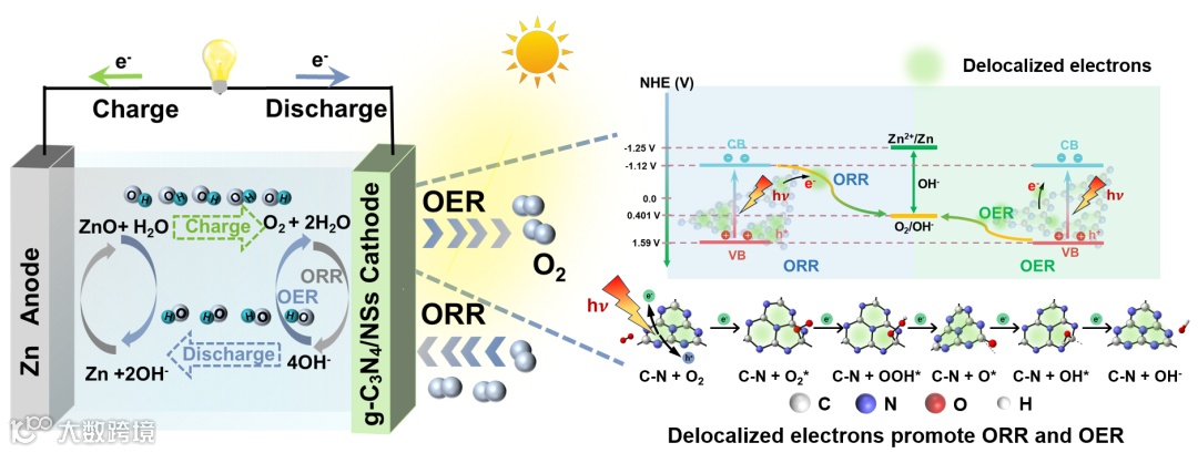图1. g-C3N4/NSs产生离域电子的方案及调控ORR/OER 中间体行为。