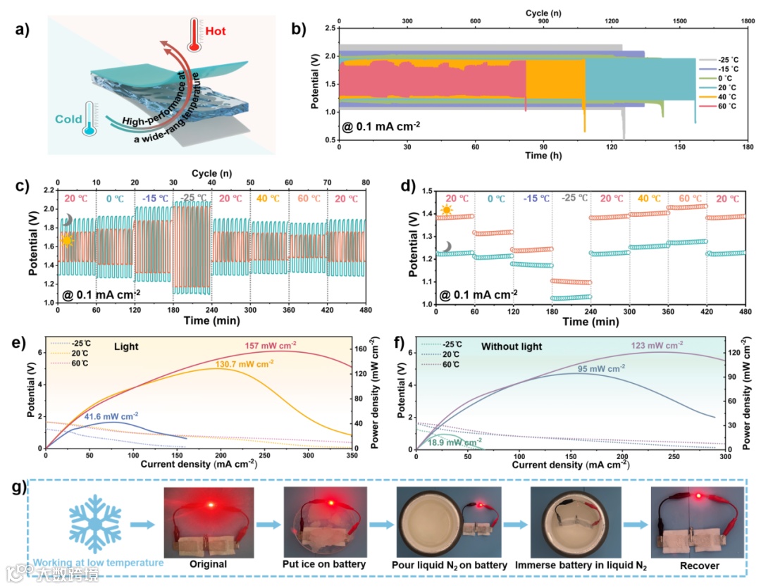 为了扩展FRZABs在室外环境中的应用,开发能适应极端温度的FRZABs显得尤为关键。FRZABs在-25~60°C内表现出优异的放电性能,连续运行周期为1580次。FRZABs对温度变化表现出很强的抵抗力,在重复的温度循环后,电压间隙完全恢复到原始状态。此外,将FRZABs放入液氮中时,由于凝胶电解质内的离子传输有限,LED灯熄灭。令人鼓舞的是,当从液氮中取出FRZABs后,LED灯恢复正常运行。