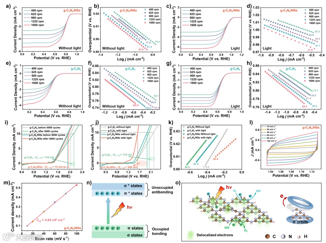 对于ORR,光照下g-C3N4/NSs的起始电位(Eonset = 1.02 V vs. RHE)和半波电位(E1/2 = 0.86 V vs. RHE)明显高于黑暗条件下的电位(Eonset = 0.89 V vs. RHE,E1/2 = 0.77 V vs. RHE),LSV计算的转移电子数在光照下约为3.8,表明离域电子有助于4e- ORR。在光照下,塔菲尔斜率显著降低(从黑暗中的83.8 mV sec-1降至光照下的57.8 mV sec-1。Tafel斜率的减小表明,光照增强了阴极催化剂的动力学,提高了电子转移速率。此外,g-C3N4/NSs的过电位降低了340 mV,在光照下(g-C3N4/NSs的塔菲尔斜率60.8 mV dec-1)远低于黑暗(87.3 mV dec-1),这进一步表明离域电子增强了OER动力学。