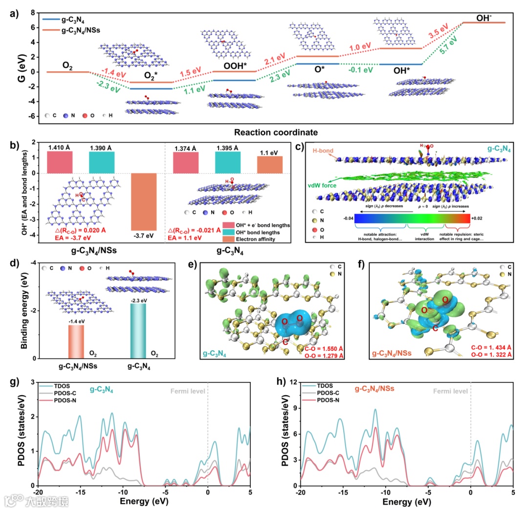 图5. 理论计算分析离域电子改变g-C3N4/NSs表面电子分布和电荷密度,增强了O2和关键中间体(OH*)的吸附和解吸行为。