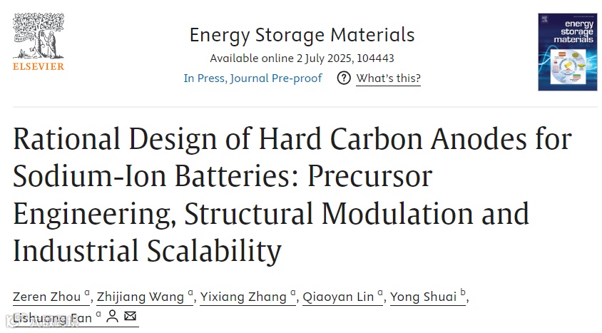 近日,来自哈尔滨工业大学的范立双团队,在Energy Storage Materials上发表题为“Rational Design of Hard Carbon Anodes for Sodium-Ion Batteries: Precursor Engineering, Structural Modulation and Industrial Scalability”的综述文章。该文章回顾了硬碳负极材料的研究进展,系统总结了硬碳负极的设计策略,并从前驱体选择→制备工艺→结构调控→储钠机制→全电池验证多个维度论述了硬碳负极在钠离子电池中面临的问题以及潜在的解决方案,为高性能硬碳的工业化提供多尺度设计蓝图。