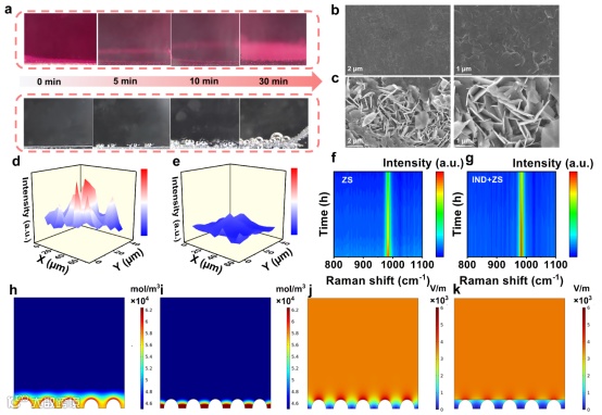 图5. (a)添加和不添加IND的电解质中Zn沉积形貌的原位光学观察;添加(b)和不添加(c) IND的电解质中锌循环50次后的SEM图像;(d) IND+ZS电解液和(e) ZS电解液循环50次后Zn电极对应的拉曼映射图;(f) IND+ZS电解质和(g) ZS电解质中锌沉积过程拉曼强度变化图;(h)模拟180秒后ZS电解质和(i) IND+ZS电解质浓度场分布(j)模拟180秒后ZS电解质和(k) IND+ZS电解质Zn2+电场分布。